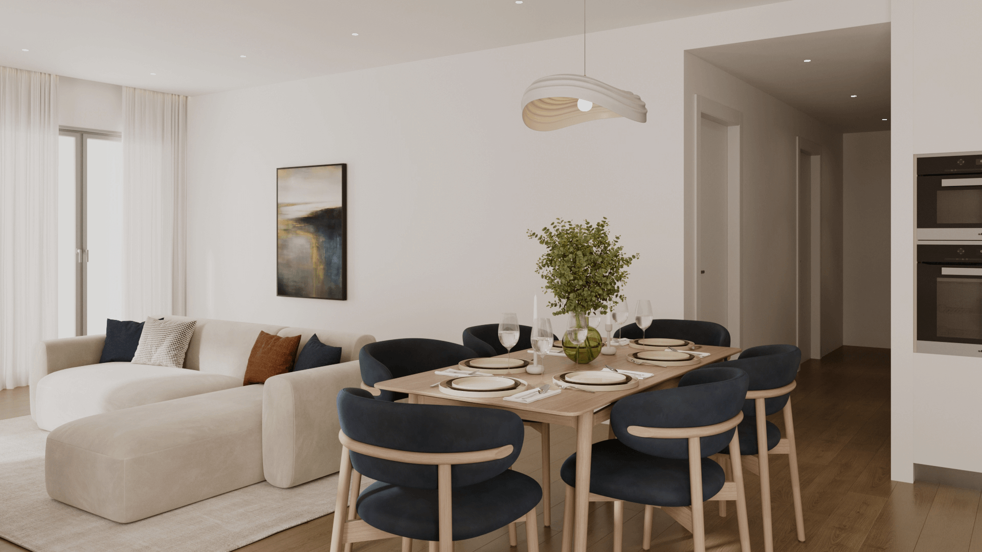 A arquitetura do Muralha Setúbal Residences combina elegância contemporânea e funcionalidade, com detalhes que criam ambientes amplos, luminosos e adaptáveis, perfeitos para o estilo de vida moderno.